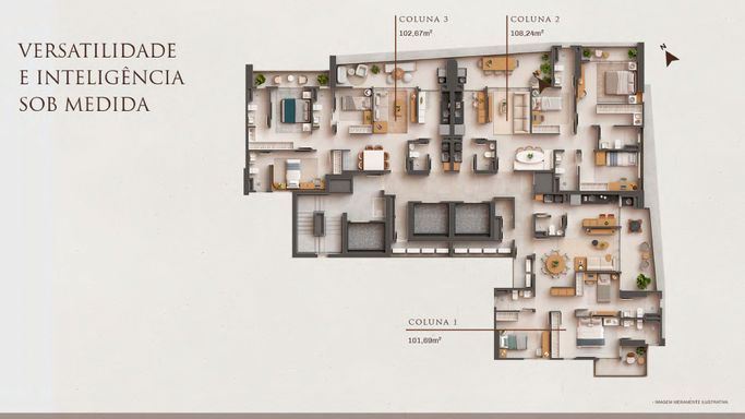 O empreendimento dispõe de unidades que vão desde 101m², 102m² até 108m² de área privativa, com 03 quartos, sendo 03 suítes. 02 vagas de garagem, varanda, sala de estar / jantar, varanda, cozinha, área de serviço. O condomínio possui área de lazer completa.